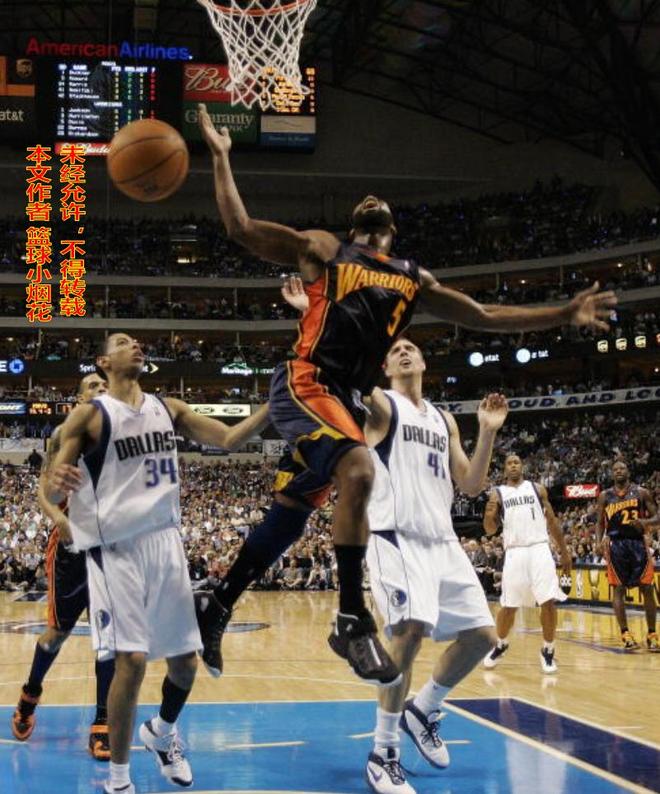 2007年4月22日,小牛的主場美航中心,勇士當(dāng)著全場兩萬多名主場觀眾的注目之下,以97:85不可思議地?fù)魯×诉_(dá)拉斯小牛,把在場邊觀戰(zhàn)的庫班的嘴都打撅撅了。